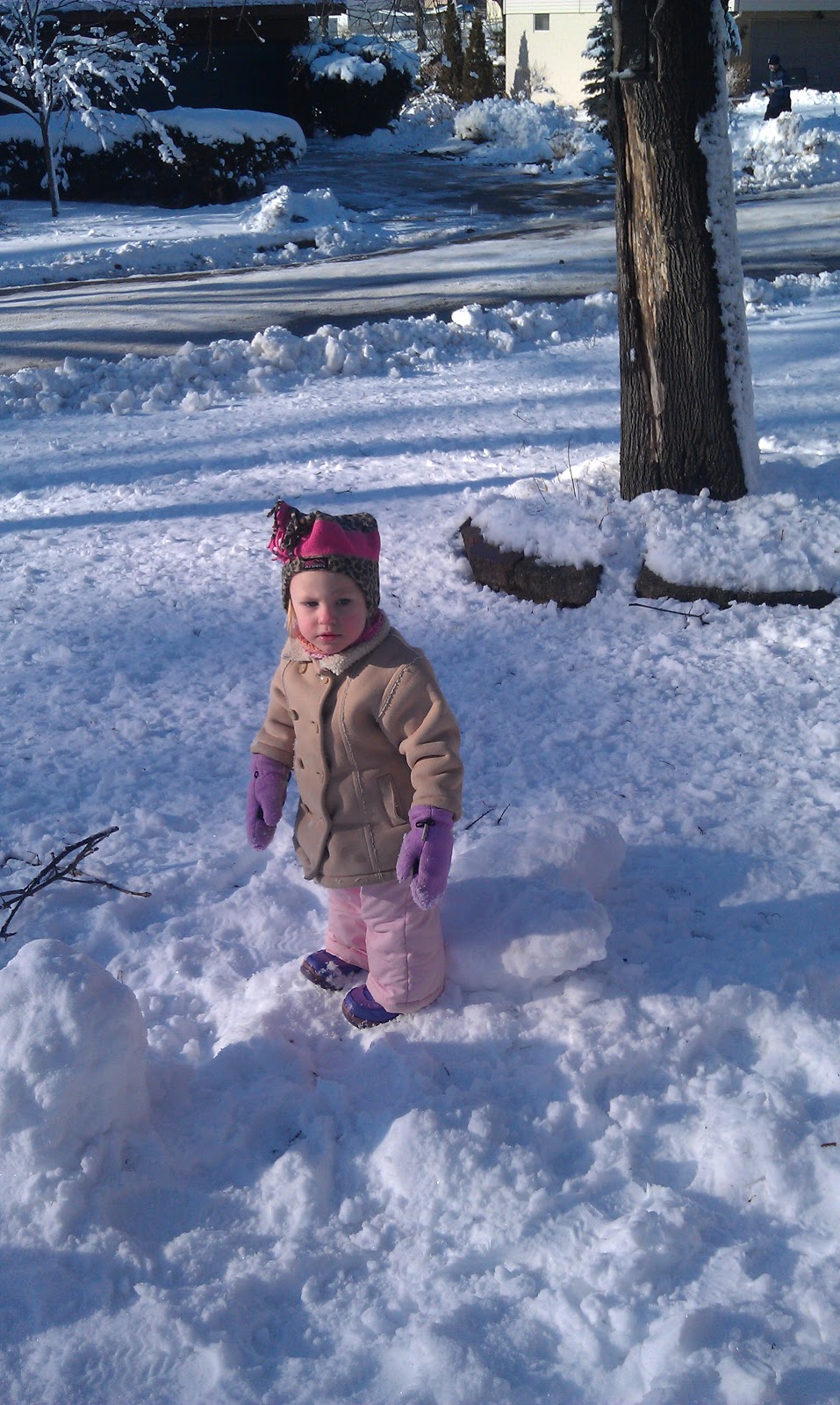 | The snow wasn't good snowman snow. It just wouldn't roll up properly, but The Angry Midget did manage to make a snow horse. She's so cute and creative. |