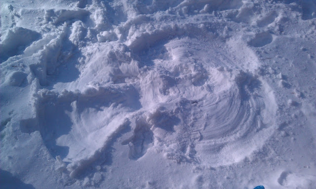 | The snow wasn't good snowman snow. It just wouldn't roll up properly, but The Angry Midget did manage to make a snow horse. She's so cute and creative. |